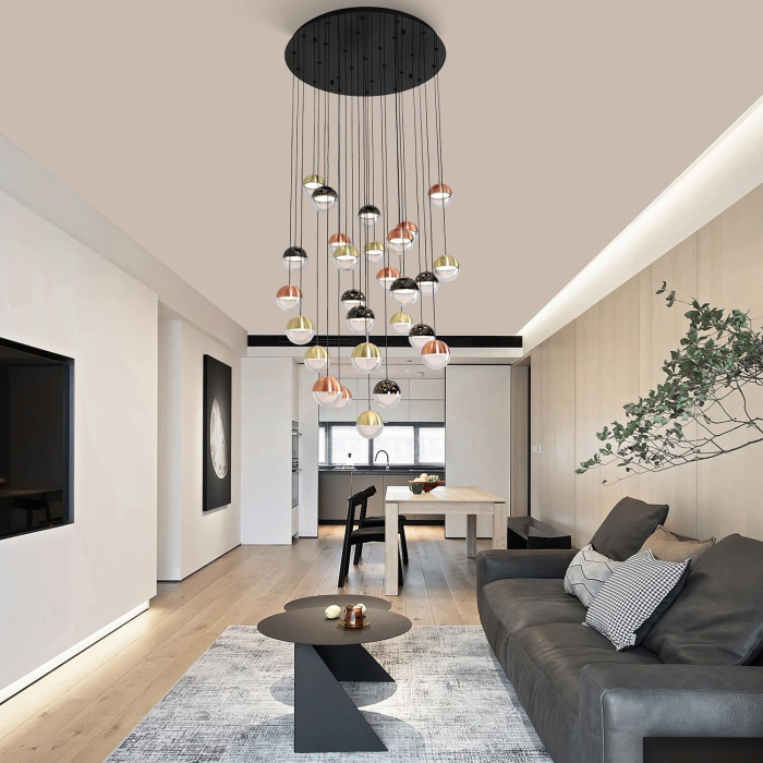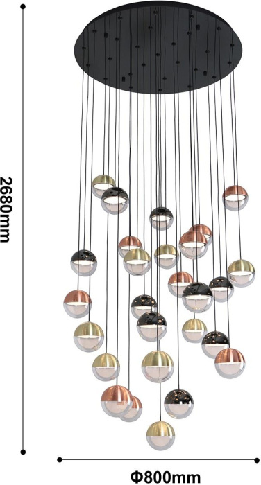 Осветительный прибор сделан в стиле Модерн. Задействуются лампочки цоколя LED мощностью 145.8 Вт, в количестве 27 ед.