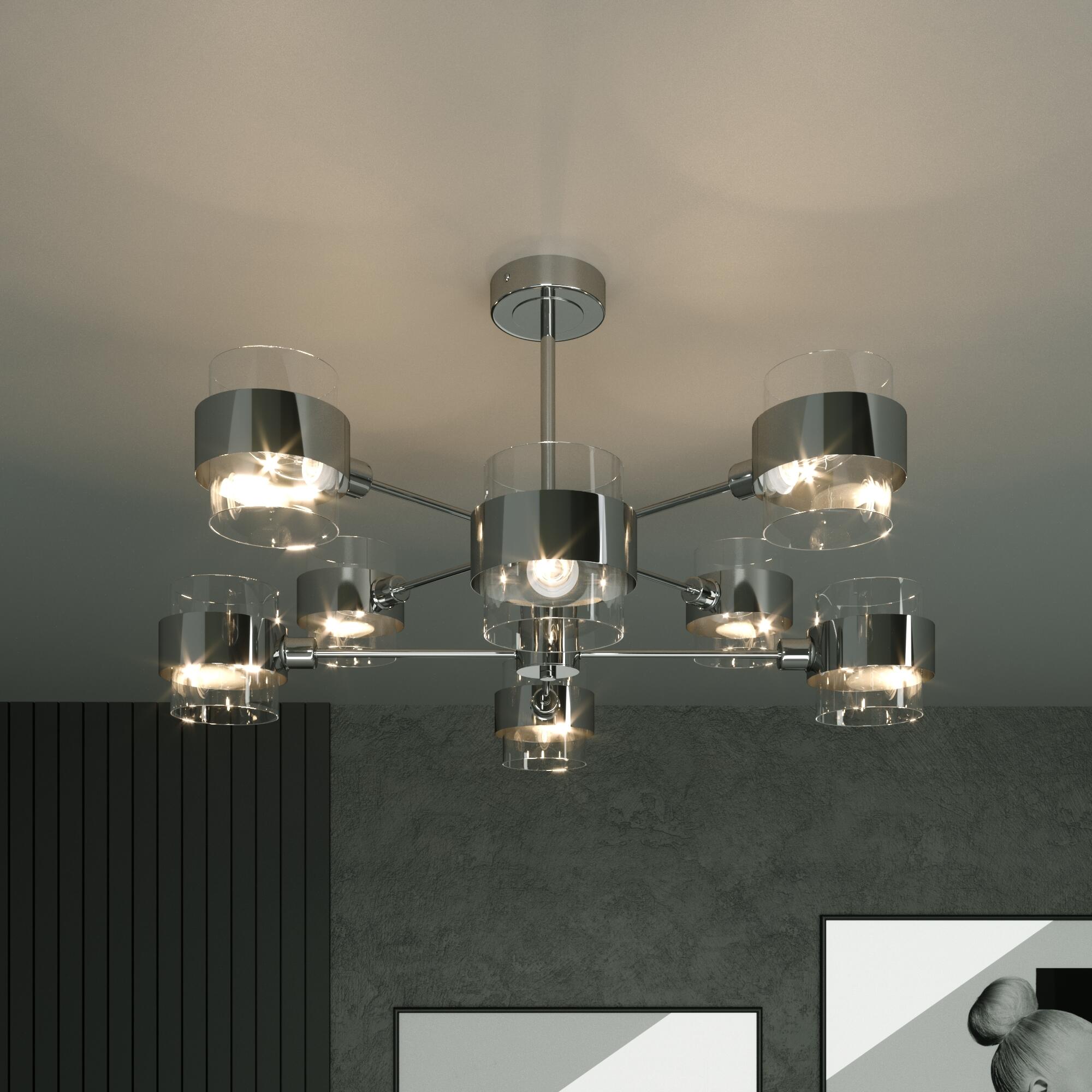 Осветительный прибор выполнен в стиле Современный. Применяются лампы цоколя E14 мощностью 60 Вт, в количестве 8 шт. Основной цвет модели a056958: Хром.