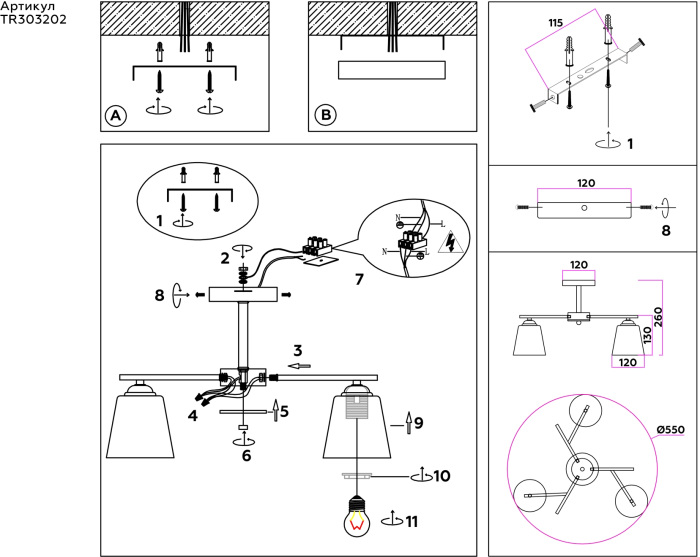 Осветительный прибор выполнен в стиле Модерн. Подходят лампы с цоколем E27 мощностью 180 Вт, количеством 3 шт. Цвет модели TR303202: Белый.