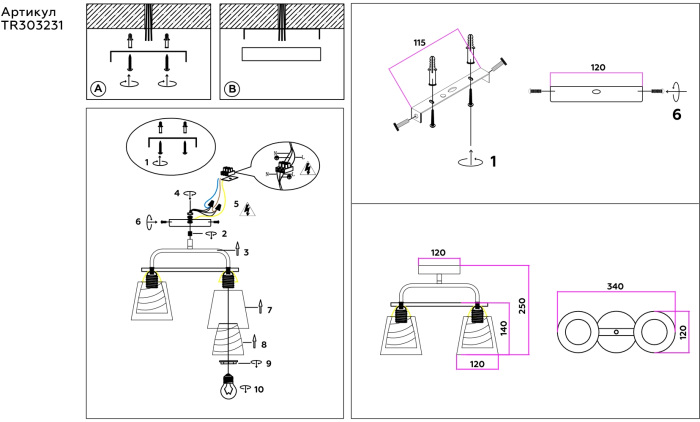 Осветительный прибор сделан в стиле Современный. Подходят лампочки с цоколем E27 мощностью 120 Вт, количеством 2 ед. Основной цвет модели TR303231: Белый,Прозрачный,Серый.