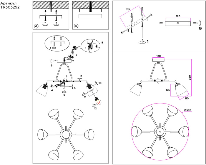 Осветительный прибор сделан в стиле Модерн. Подходят лампы с цоколем E27 мощностью 360 Вт, в количестве 6 ед. Цвет модели TR303292: Белый.