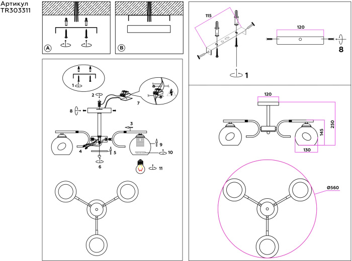 Осветительный прибор сделан в стиле Модерн. Задействуются лампы с цоколем E27 мощностью 180 Вт, в количестве 3 ед. Цвет модели TR303311: Белый.