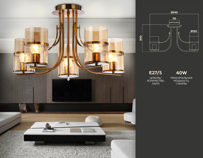 Осветительный прибор выполнен в стиле Современный. Применяются лампочки с цоколем E27 мощностью 200 Вт, в количестве 5 шт.