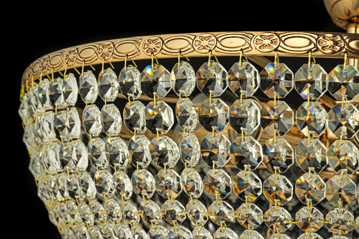 Осветительный прибор создан в стиле Арт-Деко. Применяются лампочки цоколя E27 мощностью 360 Вт, количеством 6 шт. Цвет модели Nonna E 1.3.50.503 G: Золотой.