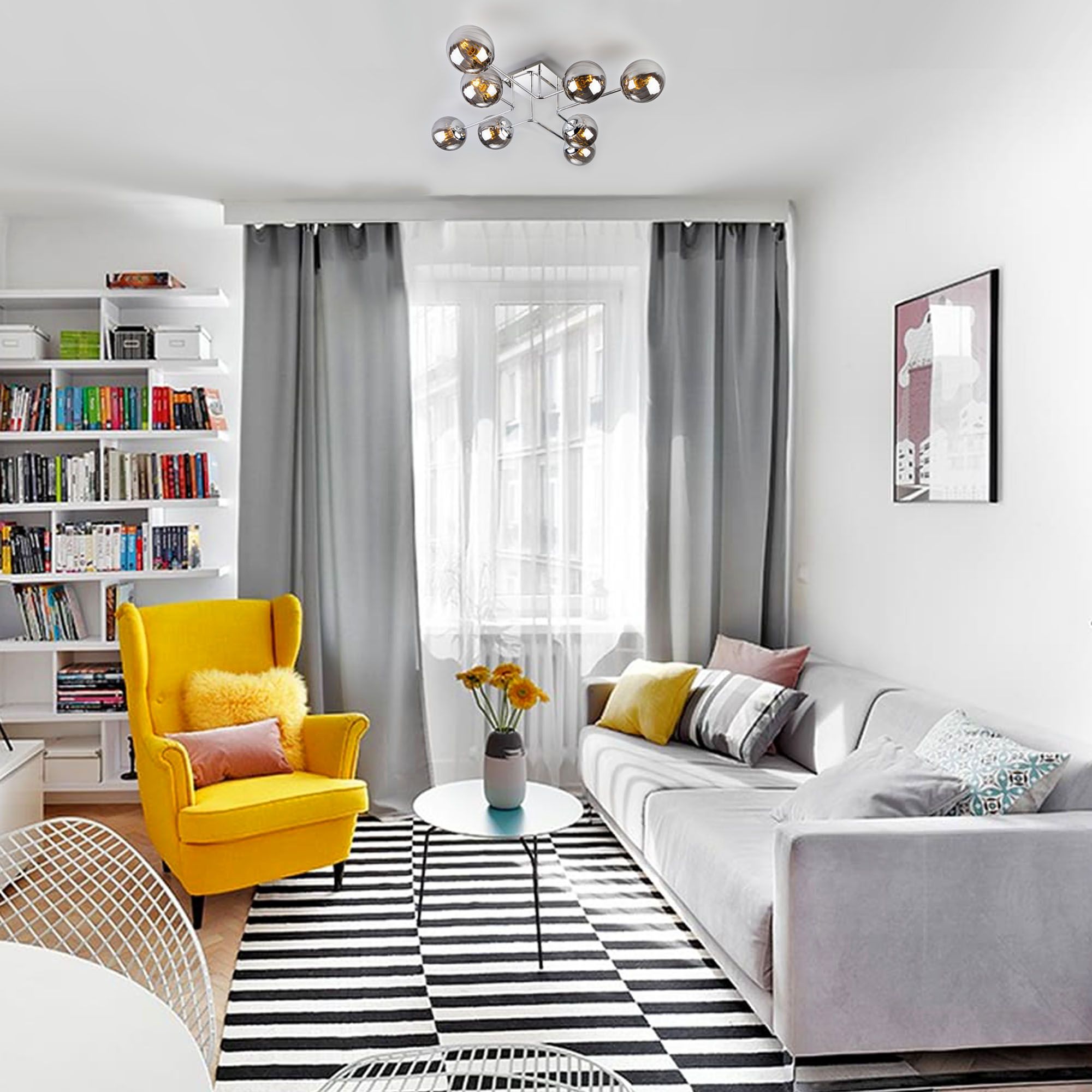 Осветительный прибор создан в стиле Хай-тек. Задействуются лампы с цоколем E14 мощностью 40 Вт, в количестве 8 ед. Цвет модели 00000086034: Серый.