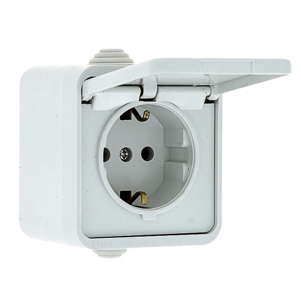 Розетка 1-местная 16А с заземлением с крышкой IP44 белая EKF Прага EKR16-029-10-44