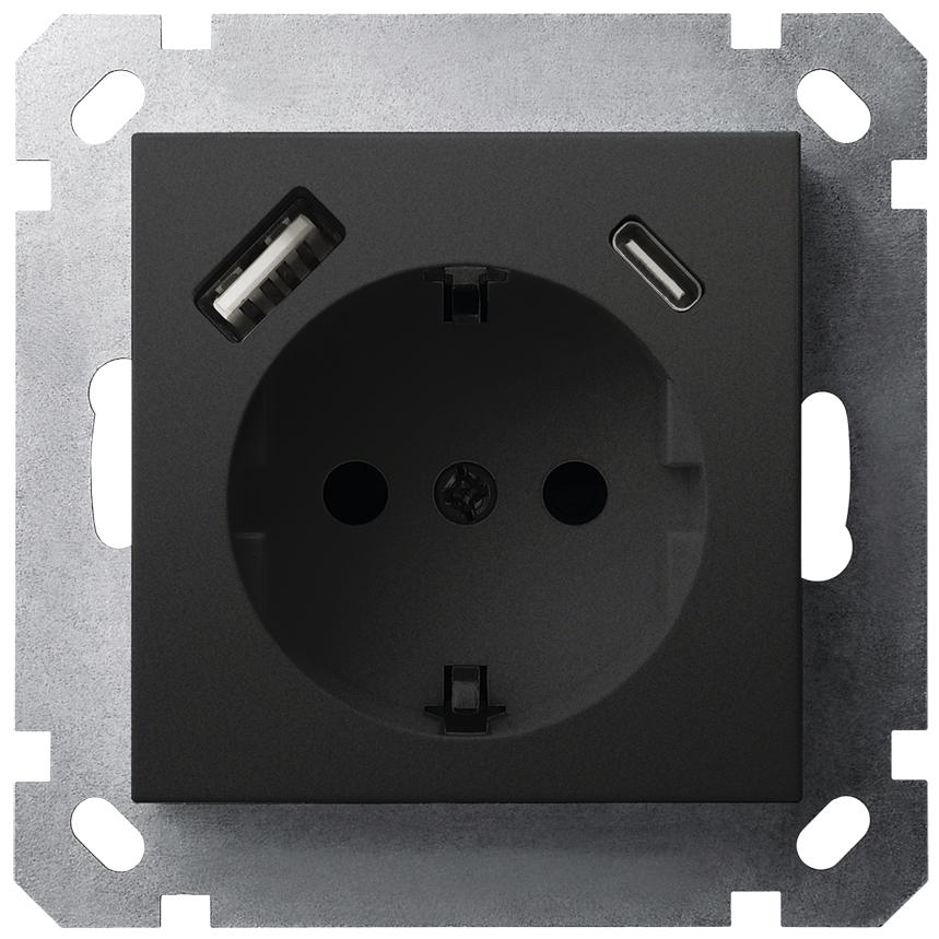 Розетка SHUKO© с USB A+C с защитными шторками 16A 250V~ 2P+T USB 25W черный матовый (soft touch) Jasmart G-Series G5501USB-25PB