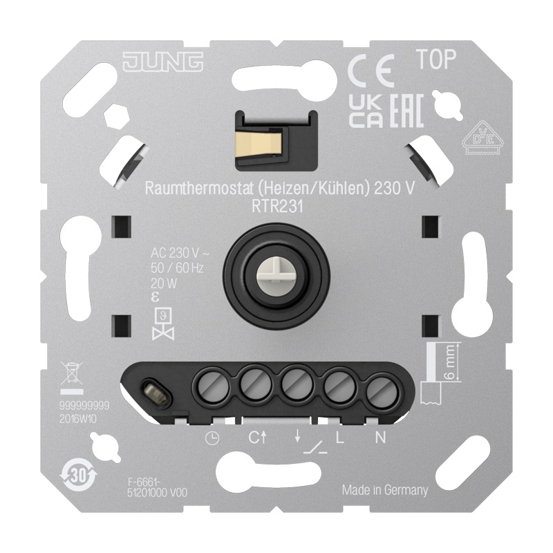 RTR231 Терморегулятор 10А, перекидной контакт, 230В поворотный, датчик t° воздуха (встроенный), без таймера Jung