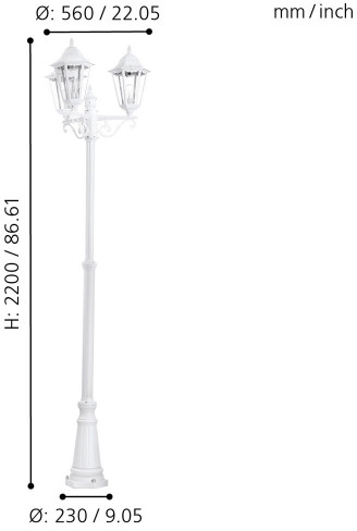 Уличный столб 93454 изготавливается брендом Eglo, относящаяся к коллекции Navedo. Размеры: высота 2200 мм, диаметр 560 мм. Уличное освещение Eglo 93454 произведены из высококачественных и прочных материалов: металл, плафон - стекло.