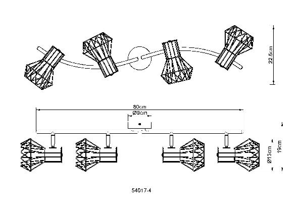 Осветительный прибор разработан в стиле Модерн. Применяются лампы цоколя E27 мощностью 160 Вт, количеством 4 ед. Основной цвет модели 54017-4: Чёрный.