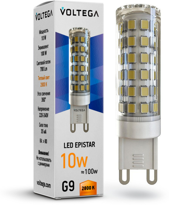 Светодиодная лампа Simple Capsule 10W 2800K G9 Voltega 7038 обладает следующими основными характеристиками: цоколь G9, мощность 10 Вт, цветовая температура 2800, влагозащита IP20.