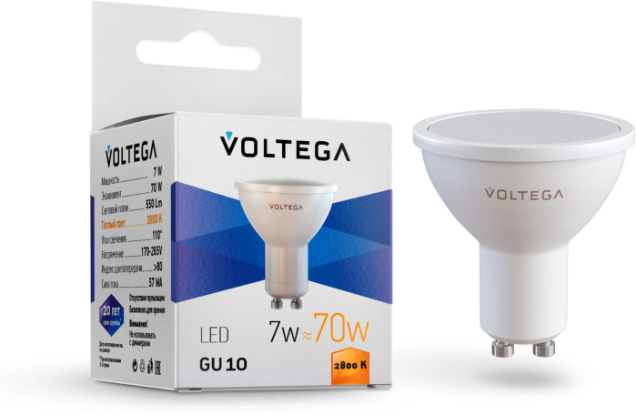 Светодиодная лампа Simple MR16 7W 2800K 110° GU10 Voltega 7056 обладает следующими основными характеристиками: цоколь GU10, мощность 7 Вт, цветовая температура 2800, влагозащита IP20.