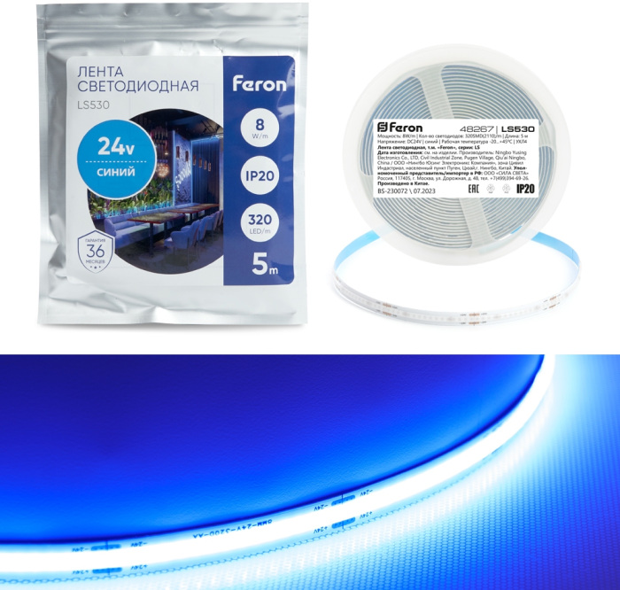 Светодиодная лента LS530 48267 Feron имеет основные параметры:, напряжение 24 В , влагозащита IP20.