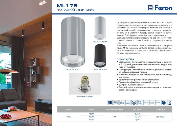 Осветительный прибор выполнен в стиле Современный. Применяются лампы цоколя GU10 мощностью 20 Вт, в количестве 1 шт. Основной цвет модели 40509: Белый.