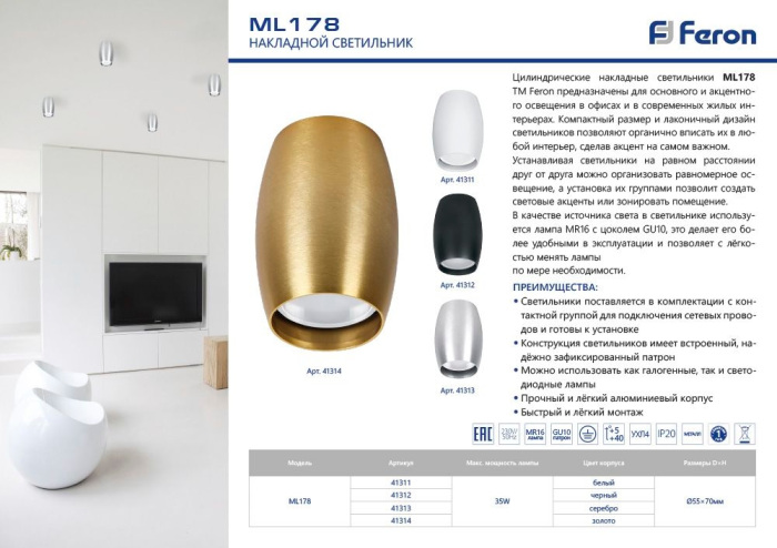 Применяются лампы цоколя GU10 мощностью 35 Вт, в количестве 1 шт. Основной цвет модели 41313: Серебряный.