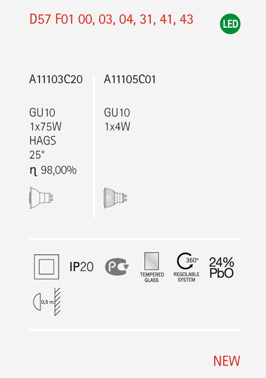 Применяются лампы цоколя GU10, количеством 1 ед. Основной цвет модели D57F0100: Прозрачный.