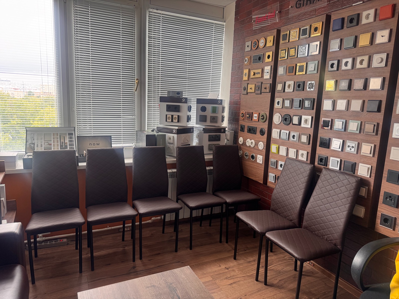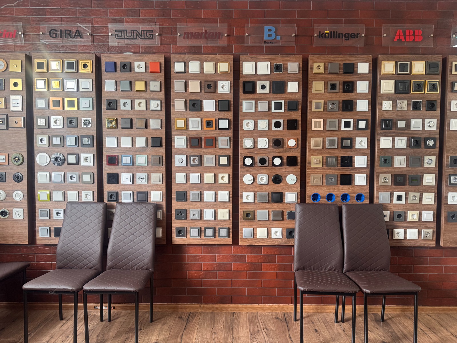 В шоуруме представлены стенды с основными европейскими брендами розеток и выключателей